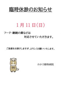1月の臨時休診日のお知らせ。継続のお薬やフードなどは対応させていただきます。