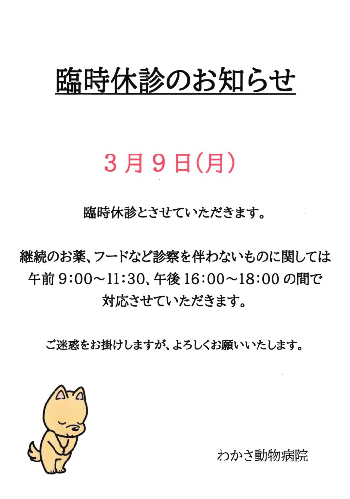 3月9日(月)は臨時休診とさせていただきます。ただし診察を伴わない、継続のお薬やフード等に関しましては対応させていただきます。ご迷惑をおかけいたしますが、よろしくお願いいたします。